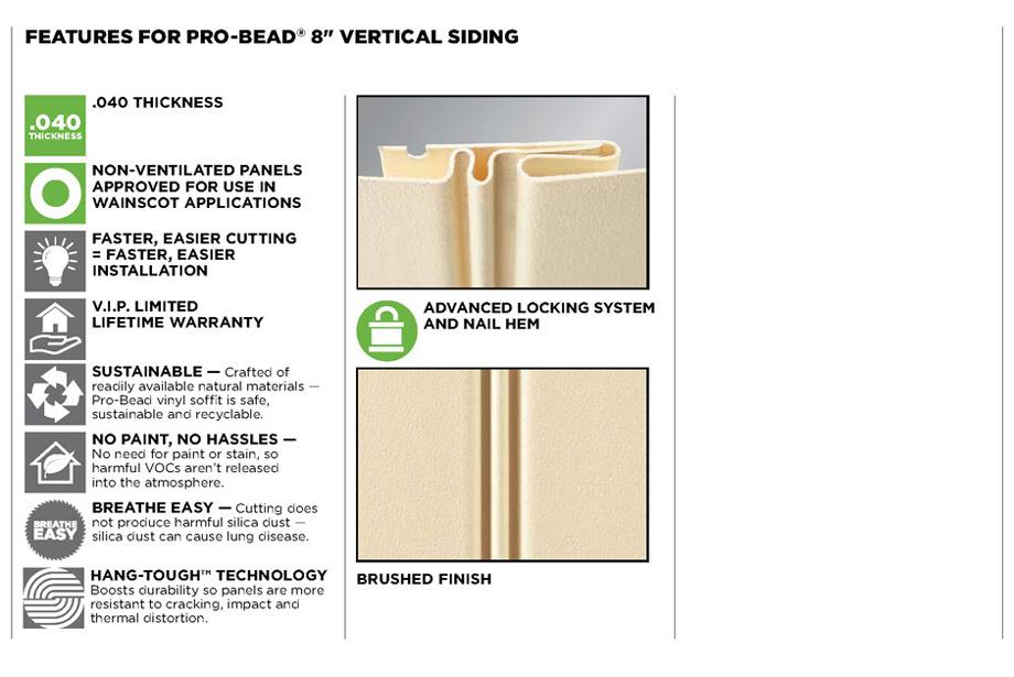 A classic 8" beaded look in a soft matte finish and the appearance of freshly painted beaded paneling. Pro-Bead vented products are not warranted for sidewall use. *Due to screen resolution limitations, product colors may not be exactly as shown.